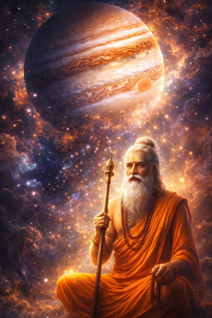 In the wisdom of the Vedic sages, the universe was alive with meaning. The great planet Jupiter, known as Guru, was seen as the celestial symbol of Brihaspati, the divine teacher of the gods. Slow, vast, and powerful in the heavens, it came to represent wisdom, guidance, and the cosmic force that leads beings from ignorance to knowledge.